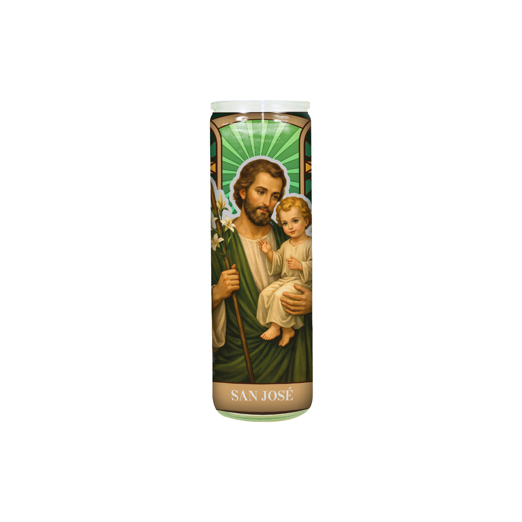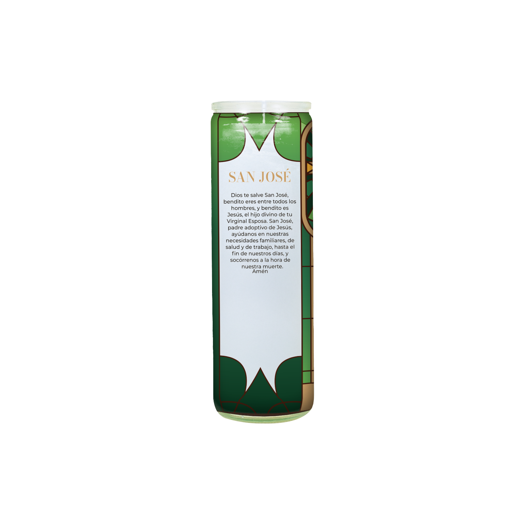 Velón en frasco de vidrio con motivo litúrgico de San José, hecho con parafina 100% pura. Cada velón ha sido meticulosamente elaborado con un pabilo de algodón encerado para garantizar una combustión uniforme y duradera.